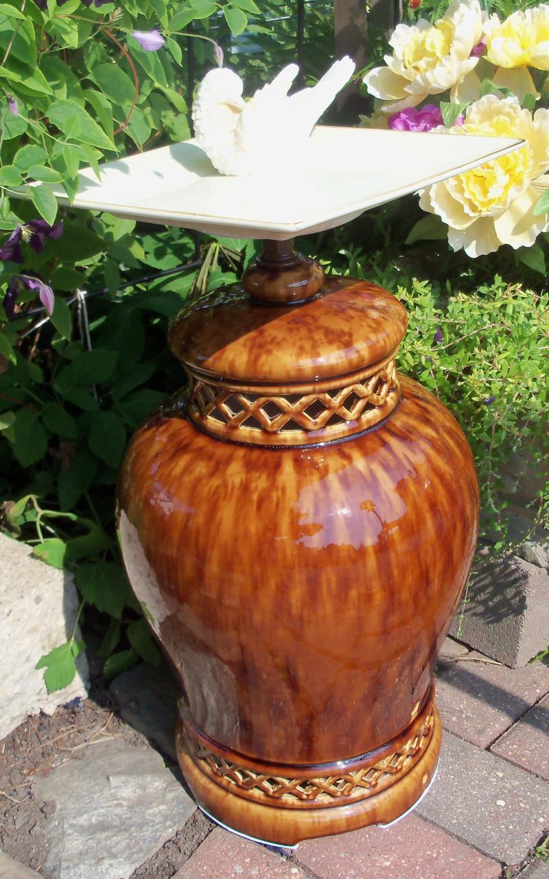 This Brown Glazed Bird Bath with Lattice Accents and a Square Bath Area. 22 Inches Tall by 14 Inches Wide.