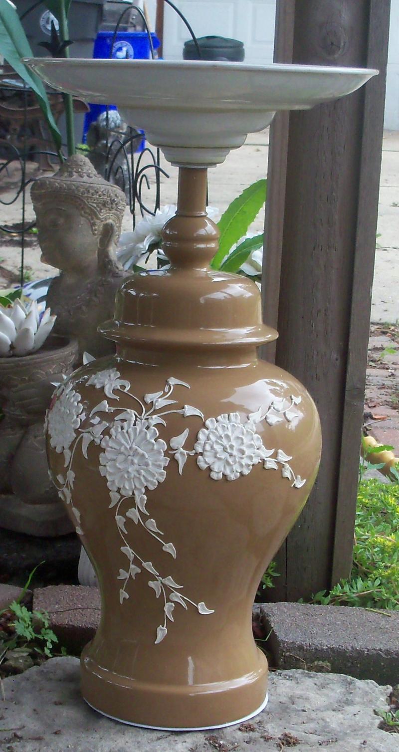Tan Bird Bath With Off White Raised Textured Flowers. 20 Inches Tall By 11 Inches Wide.