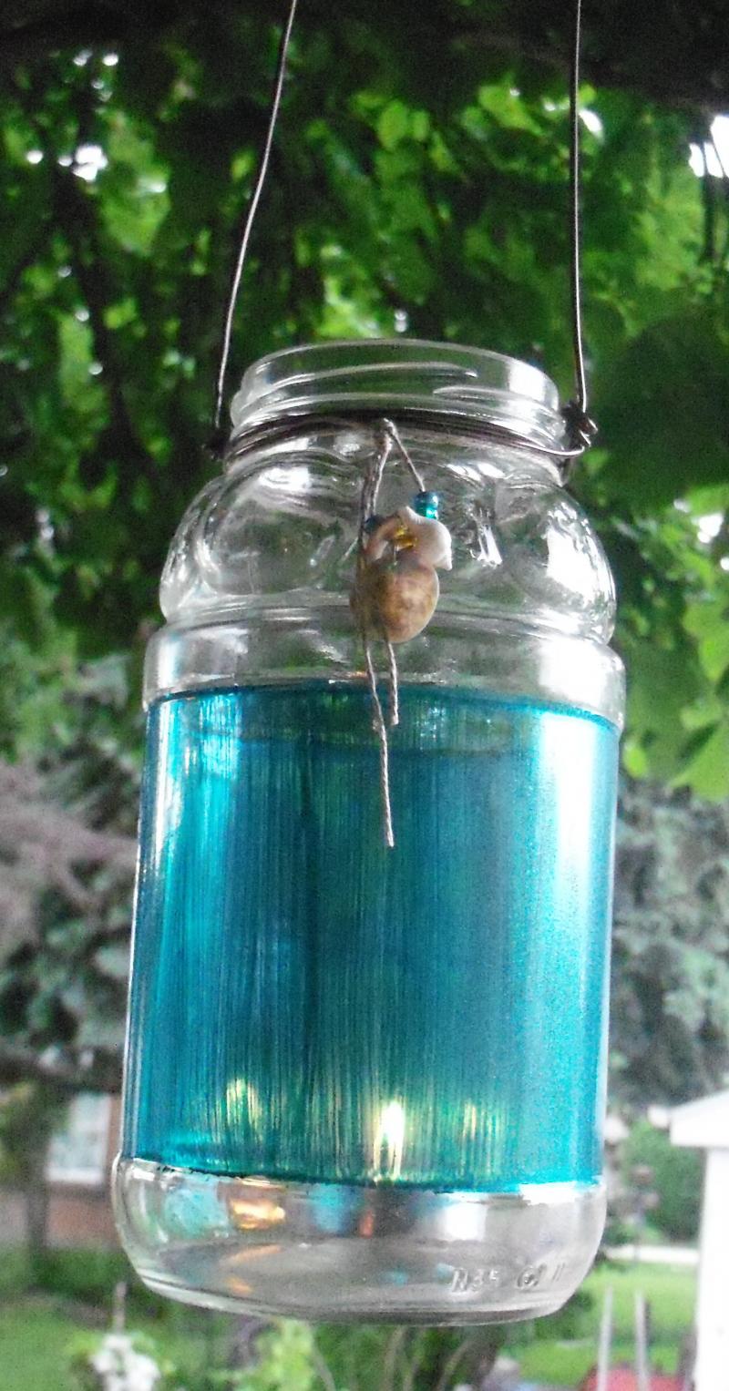Hanging Canle Lantern Decorated With Beads and Sea Shells. Painted Metalic Aqua. Glass Jar is About 7 Inches Tall and 3 Inches Wide. Total Height is 16 Inches. Item Comes With A Locking Hook For Easy Attachment to A Gazebo Rod.