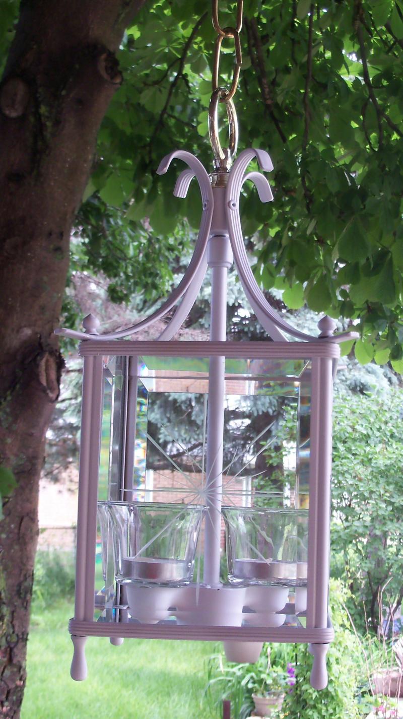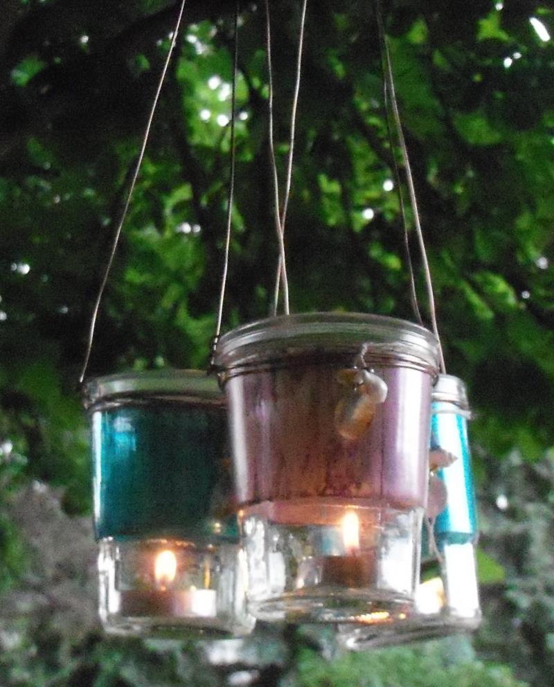 Three Hanging Candle Lanterns Decorated With Beads and Sea Shells. Painted Metalic Aqua and Purple. Glass Portion is 4 Inches High and 6 Inches Wide. Total Height is About 13 Inches High. Item Comes With A Locking Hook For Easy Attachment to A Gazebo Rod.